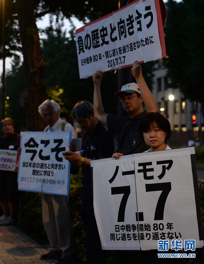 7月7日,东京市民在日本国会前手举标语集会。当日,日本东京市民团体百余人举行集会,纪念“七七事变”80周年,演讲痛斥日本军国主义对于中国人民犯下的累累罪行,呼吁日本政府正视历史,不要重蹈覆辙。新华社记者马平摄