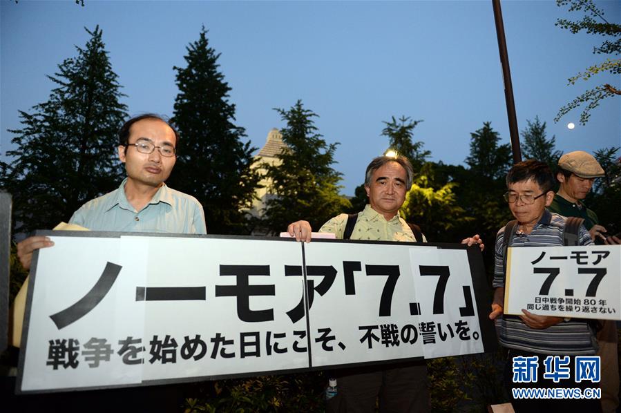 7月7日,东京市民在日本国会前手举标语集会。当日,日本东京市民团体百余人举行集会,纪念“七七事变”80周年,演讲痛斥日本军国主义对于中国人民犯下的累累罪行,呼吁日本政府正视历史,不要重蹈覆辙。新华社记者马平摄
