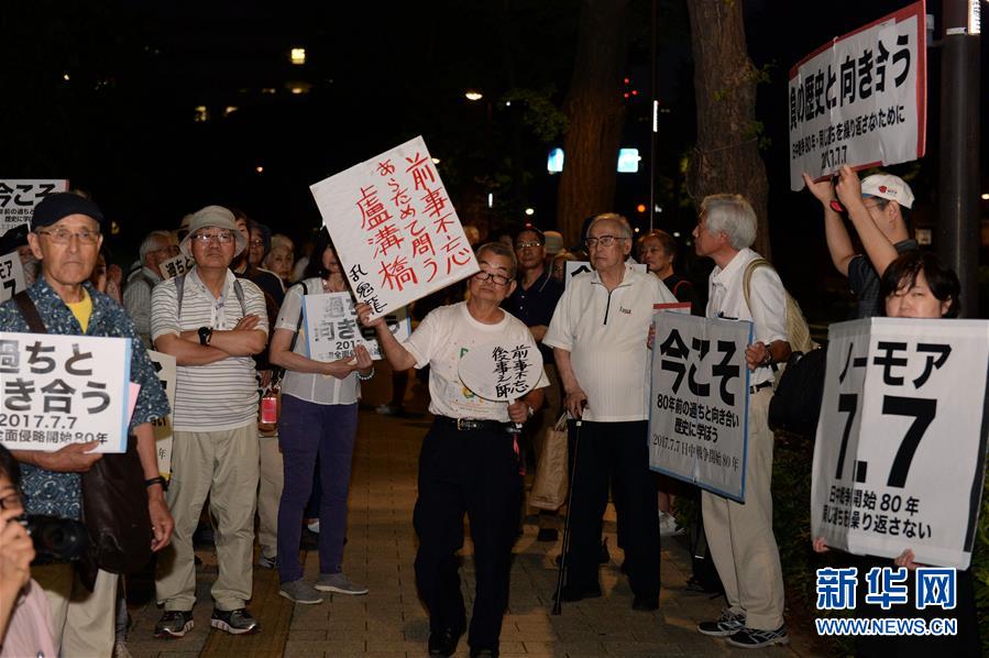 7月7日,东京市民在日本国会前手举标语集会。当日,日本东京市民团体百余人举行集会,纪念“七七事变”80周年,演讲痛斥日本军国主义对于中国人民犯下的累累罪行,呼吁日本政府正视历史,不要重蹈覆辙。新华社记者马平摄