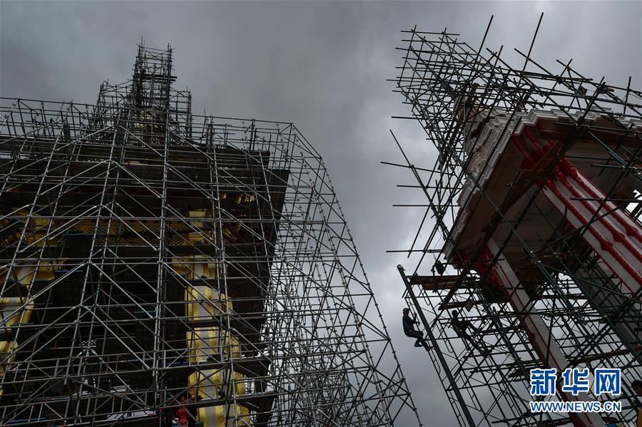 8月8日,在泰国曼谷,工人们在普密蓬国王遗体火化台建设工地的脚手架上施工。泰国将于2017年10月25日至29日为已故国王普密蓬·阿杜德举行葬礼。在为期五天的葬礼中,普密蓬国王遗体将于2017年10月26日在曼谷王家田广场上修建的火化台进行火化。普密蓬国王遗体火化台于2017年1月动工修建,计划于9月完工。新华社记者李芒茫 摄