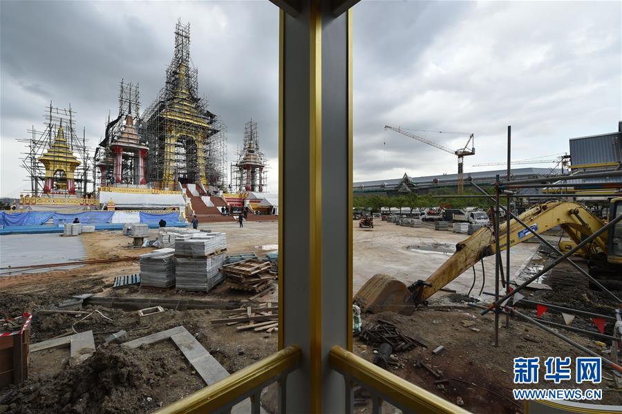 这是8月8日在泰国曼谷拍摄的普密蓬国王遗体火化台施工现场。泰国将于2017年10月25日至29日为已故国王普密蓬·阿杜德举行葬礼。在为期五天的葬礼中,普密蓬国王遗体将于2017年10月26日在曼谷王家田广场上修建的火化台进行火化。普密蓬国王遗体火化台于2017年1月动工修建,计划于9月完工。新华社记者李芒茫 摄