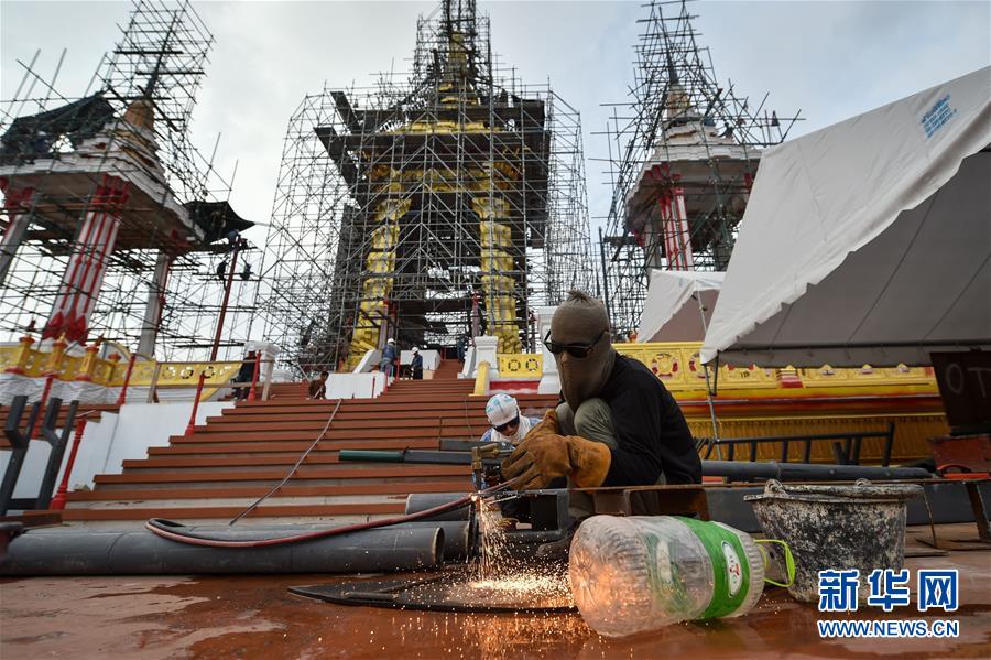 8月8日,在泰国曼谷,一名工人在普密蓬国王遗体火化台建设工地进行电焊作业。泰国将于2017年10月25日至29日为已故国王普密蓬·阿杜德举行葬礼。在为期五天的葬礼中,普密蓬国王遗体将于2017年10月26日在曼谷王家田广场上修建的火化台进行火化。普密蓬国王遗体火化台于2017年1月动工修建,计划于9月完工。新华社记者李芒茫 摄
