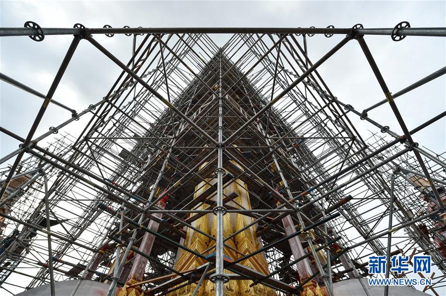 这是8月8日在泰国曼谷拍摄的普密蓬国王遗体火化台施工现场。泰国将于2017年10月25日至29日为已故国王普密蓬·阿杜德举行葬礼。在为期五天的葬礼中,普密蓬国王遗体将于2017年10月26日在曼谷王家田广场上修建的火化台进行火化。普密蓬国王遗体火化台于2017年1月动工修建,计划于9月完工。新华社记者李芒茫 摄