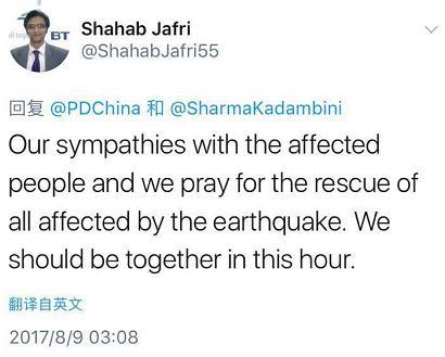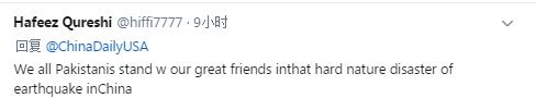 “巴铁”网友@Hafeez Qureshi:“在中国发生的这场地震灾害中,我们所有的巴基斯坦人民和伟大的中国朋友站在一起!”