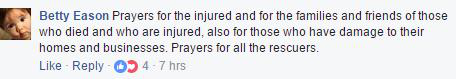 美国网友@Betty Eason:“为受伤者、遇难者及其家属和朋友以及遭受家园及财产损失的人表示祈祷和哀悼,祈祷所有救援人员平安”。
