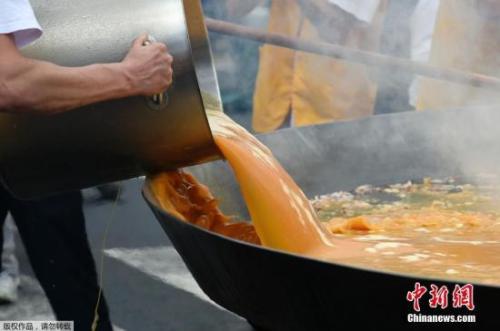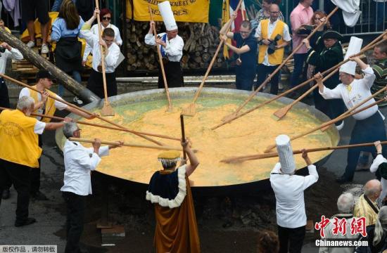 当地时间8月15日,比利时马尔梅迪小镇庆祝传统节日,用6500个鸡蛋制作出直径4米的煎蛋饼。