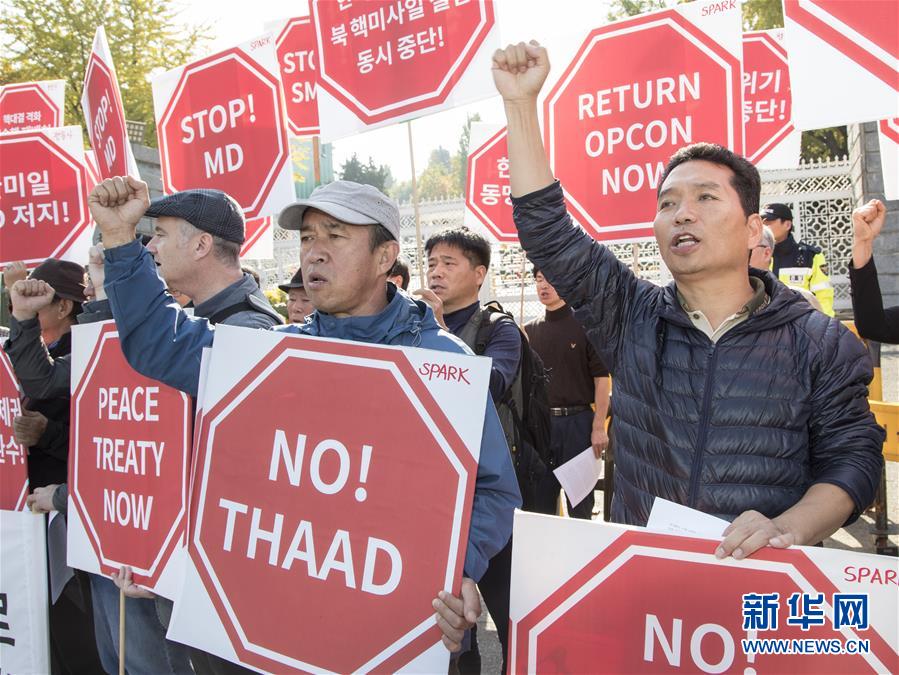 10月28日,在位于首尔的韩国国防部外,韩国民众手举“反对萨德”、“反对战争”等内容的标语参加和平示威。韩国国防部28日发布消息说,第49次韩美安保会议当天在首尔召开。韩美双方一致同意美国在韩国增加战略武器部署,以进一步巩固两国军事同盟。新华社发(李相浩摄)