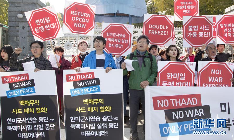 10月28日,在位于首尔的韩国国防部外,韩国民众手举“反对萨德”、“反对战争”等内容的标语参加和平示威。韩国国防部28日发布消息说,第49次韩美安保会议当天在首尔召开。韩美双方一致同意美国在韩国增加战略武器部署,以进一步巩固两国军事同盟。新华社发(李相浩摄)