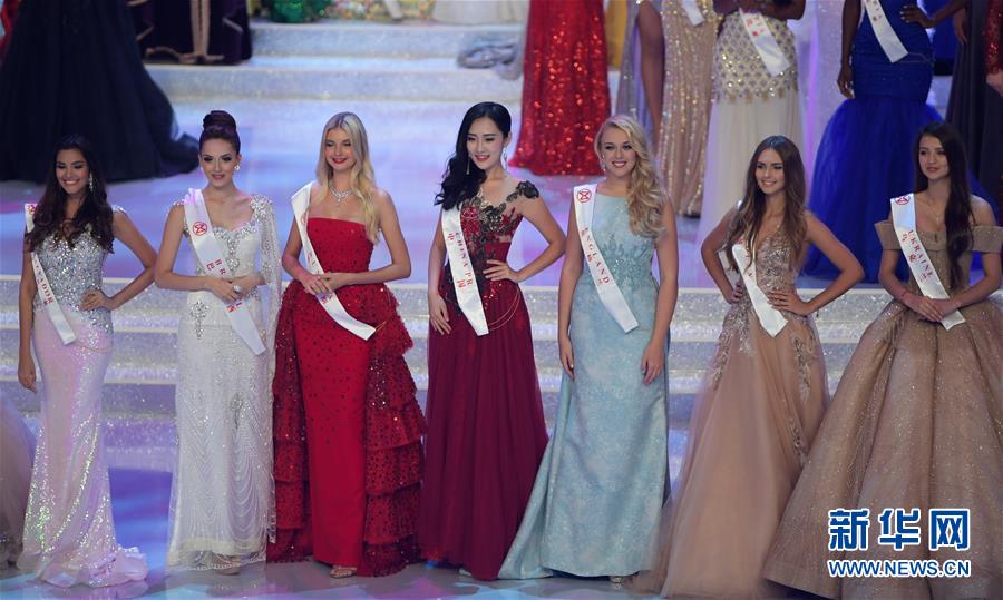 11月18日,中国小姐关思宇(中)在总决赛的比赛中。当日,2017年第67届世界小姐全球总决赛在海南三亚举行,来自印度的马努希·奇希拉摘得桂冠。新华社记者 杨冠宇 摄