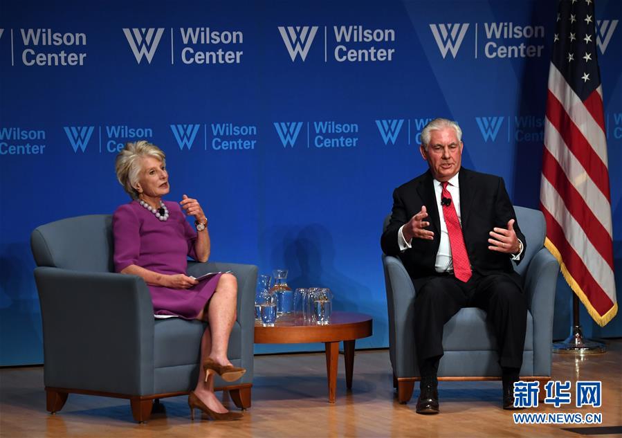 11月28日,美国国务卿蒂勒森(右)在华盛顿的威尔逊中心出席活动。美国国务卿蒂勒森28日在华盛顿表示,美国将继续致力于维护欧洲安全,但欧洲各国必须对自身安全挑战负起更大责任。新华社记者殷博古摄