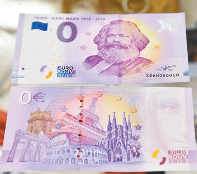 为纪念马克思诞辰200周年,欧洲央行授权特里尔市政府出资发行零欧元纪念钞。