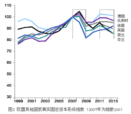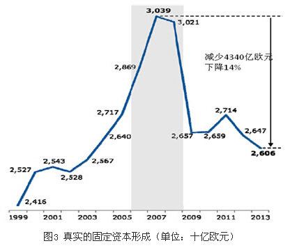 2007-2013年期间,投资下降占据了GDP下降中的绝大部分,跟上美国的投资速度,2012-2013区间,欧盟需要额外增加5400亿欧元投资。长期来看,缺乏投资损害经济增长和竞争力提升。欧元区投资疲弱乏力对资本市场造成严重影响,进而不利于欧盟经济增长和就业改善等。