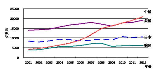 图1 2001—2012年四国制造业增加值变化曲线