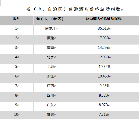 2017年12月,全国31个省(市、自治区)旅游酒店价格与上个月相比,波动幅度最大的省(市、自治区)为黑龙江,环比增长35.61%。