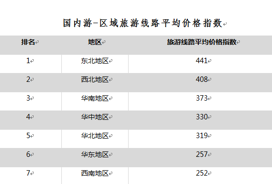 2017年12月,国内游-区域旅游线路平均价格指数最高的东北地区为441元/人天,平均出行时间为6天;国内游-区域旅游线路平均价格指数最低的西南地区为252元/人天,平均出行时间为7天。