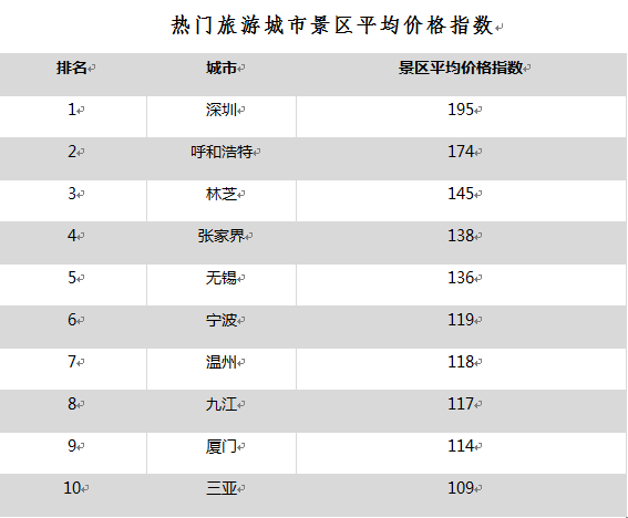 2017年12月,在系统监测的60个热门旅游城市里,景区平均价格指数最高的前3个城市为深圳、呼和浩特、林芝。