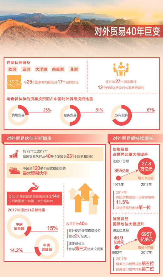“不断扩大对外开放、提高对外开放水平,以开放促改革、促发展,是我国发展不断取得新成就的重要法宝。”改革开放40年来,我国在对外贸易领域不断开拓新格局,实现历史性跨越。1978年到2017年,中国贸易伙伴从40多个发展到231个国家和地区;进出口总额从355亿元人民币提高到27.8万亿元人民币,增长782倍;中国是120多个国家和地区的最大贸易伙伴;中国累计使用外商直接投资超过2万亿美元。