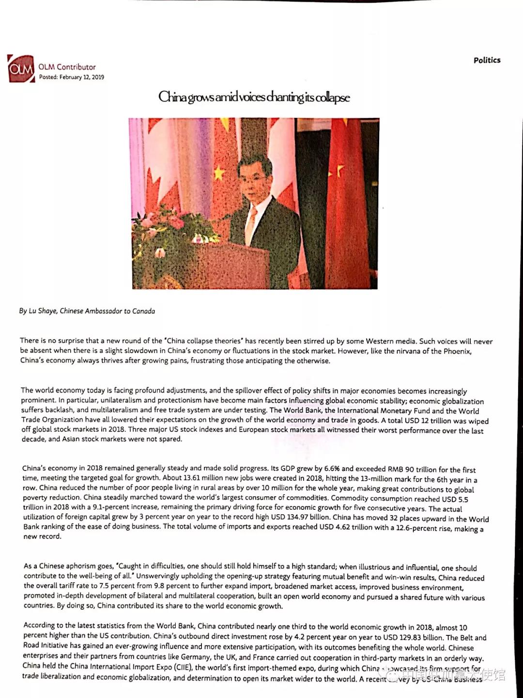 据中国驻加拿大使馆微信公众号消息,2019年2月12日,驻加拿大大使卢沙野在加《渥太华生活》杂志发表题为《中国在“崩溃论”的伴奏中发展壮大》的署名文章。全文如下: