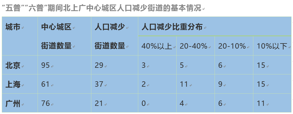 “五普”“六普”期间北上广中心城区人口减少街道的基本情况