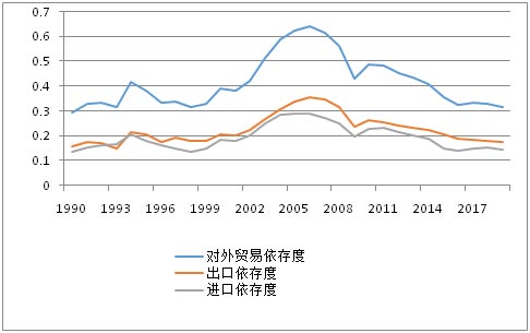 通过开放沿海、沿江进而逐步形成全方位对外开放格局,实施招商引资、鼓励出口战略以及加入WTO,外需为我们充分利用人力资源提供了大量出口的机会。1978年到2017年,我国货物进出口总额从355亿元提高到31.5万亿元,增长887倍。其中,出口总额从168亿元提高到17.2万亿元,增长1023倍。对外贸易占GDP的比重(对外贸依存度)由1990年的29%,在2006年达到峰值为64%(出口和进口依存度也相应达到最高的25%和29%),之后有所回落,至2019年为32%。货物贸易占世界比重大幅提升,改革开放初期,我国货物进出口占国际市场份额仅为0.8%,在全球货物贸易中列第29位。2006年,中国货物进出口总额占世界份额的7.17%,其中出口占世界的8%。虽然贸易依存度在2006年以后有所下降,但是占国际市场份额还是在不断上升,2017年我国进出口占全球份额为11.5%,货物贸易居全球第一,其中出口占比为12.8%。