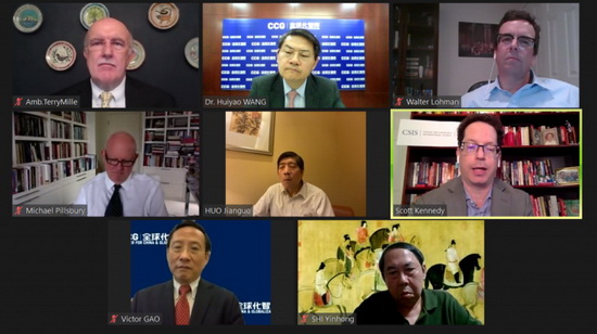2020年8月6日,全球化智库(CCG)举办了一场以“中美关系路在何方:末日决战还是可控竞争?”为主题的线上闭门研讨会。会上,来自美国的右翼保守派智库专家美国哈德逊研究所(Hudson Institute)中国战略研究中心主任白邦瑞(Michael Pillsbury),美国传统基金会(Heritage Foundation)国际经贸研究中心主任、美国驻联合国前大使特里·米勒(Terry Miller),美国传统基金会亚洲研究中心主任沃尔特·罗曼(Walter Lohman),美国战略与国际问题研究中心(Center for Strategic and International Studies, CSIS)费和中国研究项目副主任兼中国商务与政治经济研究课题主任甘思德(Scott Kennedy)与CCG主任王辉耀,CCG 副主任高志凯,CCG高级研究员、商务部国际贸易经济合作研究院前院长霍建国以及CCG学术委员会专家,中国人民大学美国研究中心主任时殷弘四位中国智库专家就中美如何看待双方竞争的实质、如何评估中美“脱钩”的后果、中美贸易谈判走向、美国单边政策的可行性等话题展开研讨。本次会议由CCG主任王辉耀主持。