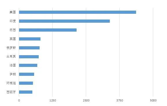 图4:世界排名前十位的国家的确诊新冠病毒病例情况(万例)