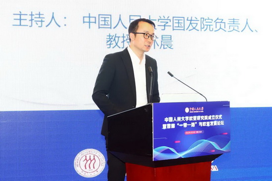 成立仪式后,人大国发院负责人林晨教授主持论坛研究报告发布和嘉宾研讨环节。林晨表示,欧亚研究院的成立,是中国人民大学与各方领导、各界同仁好友汇报、相聚、分享成果的开端,未来中国人民大学欧亚研究院将在各方的指导、关心下努力耕耘、再创佳绩。