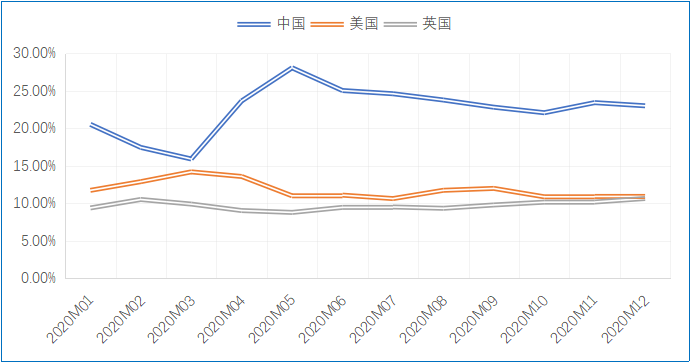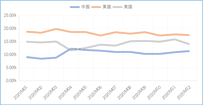 2020年,欧盟与中国实现贸易总额5860.32亿欧元,同比增长4.46%,中国在欧盟对外贸易总额中占比达到16.07%,同比上升2.3个百分点,中国成为欧盟最大贸易伙伴。美国和英国在欧盟对外贸易总额中占比分别为15.22%和12.20%,为欧盟第二大和第三大贸易伙伴。中国在疫情最为严重的2、3月份降为欧盟第三大贸易伙伴;4月份,随着中国复工复产复市的推进,以及疫情在全球范围内的扩散,中国一跃成为欧盟第一大贸易伙伴,并维持至2020年12月。美国则由4月开始降为欧盟第二大贸易伙伴,直至2020年结束。