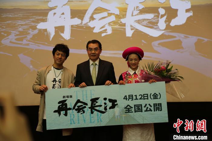当地时间4月7日,电影版《再会长江》试映会在中国驻日本大使馆举行。图为日本纪录片导演竹内亮(左一)、中国驻日本大使吴江浩(左二)以及《再会长江》主人公之一茨姆(右一)在现场合影。记者 朱晨曦 摄