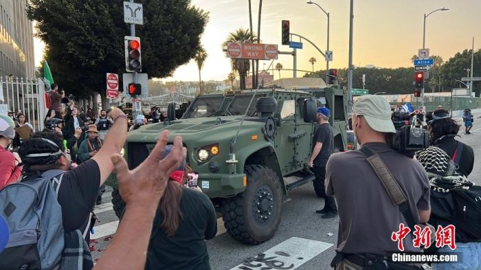 当地时间2025年6月10日,美国加利福尼亚州洛杉矶市中心的反搜捕非法移民行动抗议示威仍在持续,图为情绪激动的抗议者围堵军车。中新社记者 张朔 摄