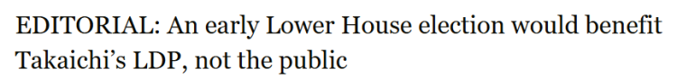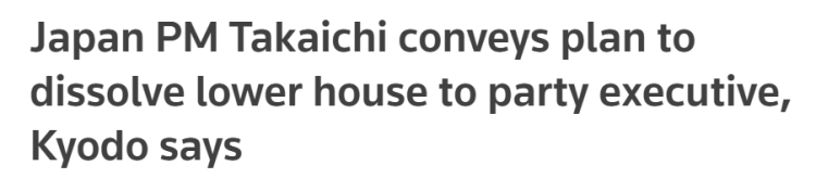 高市早苗目前面临多方压力:自民党和日本维新会组成的执政联盟在众议院席位勉强过半、在参议院则处于少数,这种局面导致其要推动防卫预算等法案在国会面临重重阻力;自民党内部派系林立,高市早苗在党内根基不稳,而执政联盟内部也存在潜在的矛盾;高市早苗的经济与民生政策还未取得看得见的成果,其希望通过提前大选尽快摆脱内外压力。