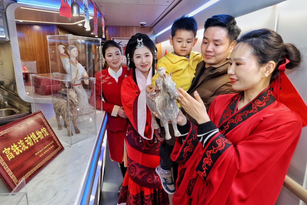 2月11日,西安北开往香港西九龙的G916次陕港高铁列车上,身着汉服的工作人员向旅客展示汉代马形文物复制品,并讲解相关历史文化。(国铁西安局集团公司供图)