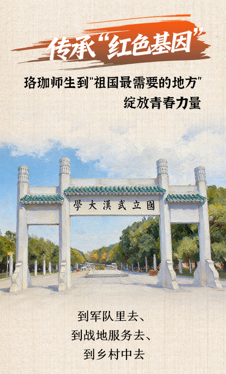 从战火纷飞时“到军队里去、到战地服务去、到乡村中去”的热血感召,到复兴伟业中“到西部去、到基层去、到祖国最需要的地方去”的坚定抉择,珞珈山下的青春面孔在变,但那份融于血脉的红色基因始终如一。