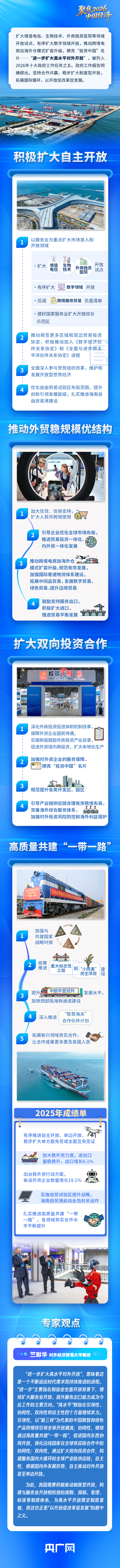 “进一步扩大高水平对外开放”列入政府工作报告今年十大工作任务第五位。报告明确提出,坚持合作共赢,稳步扩大制度型开放,拓展国际循环,以开放促改革促发展。“进一步”意味着什么?“高水平”应如何理解?央广网约请相关专家进行解读。