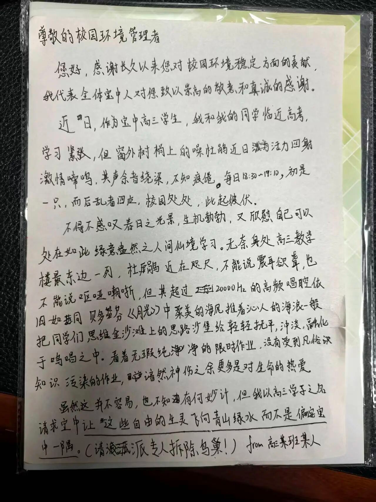 诚然,在高考冲刺的关键时刻,嘈杂又有穿透力的鸟鸣确实难免打乱解题思路,学生对安静学习环境的渴望无可厚非。但可贵的是,学生在表达诉求时并未陷入“非此即彼”的偏执,而是以“让这些自由的生灵飞向青山绿水”的表述,传递了理性与善意。这种在压力之下仍能情绪稳定地表达诉求,也是教育润物无声的成果。不再以自我为中心的少年,学着在矛盾中寻得平衡,学着与世界相处、与万物共生。
