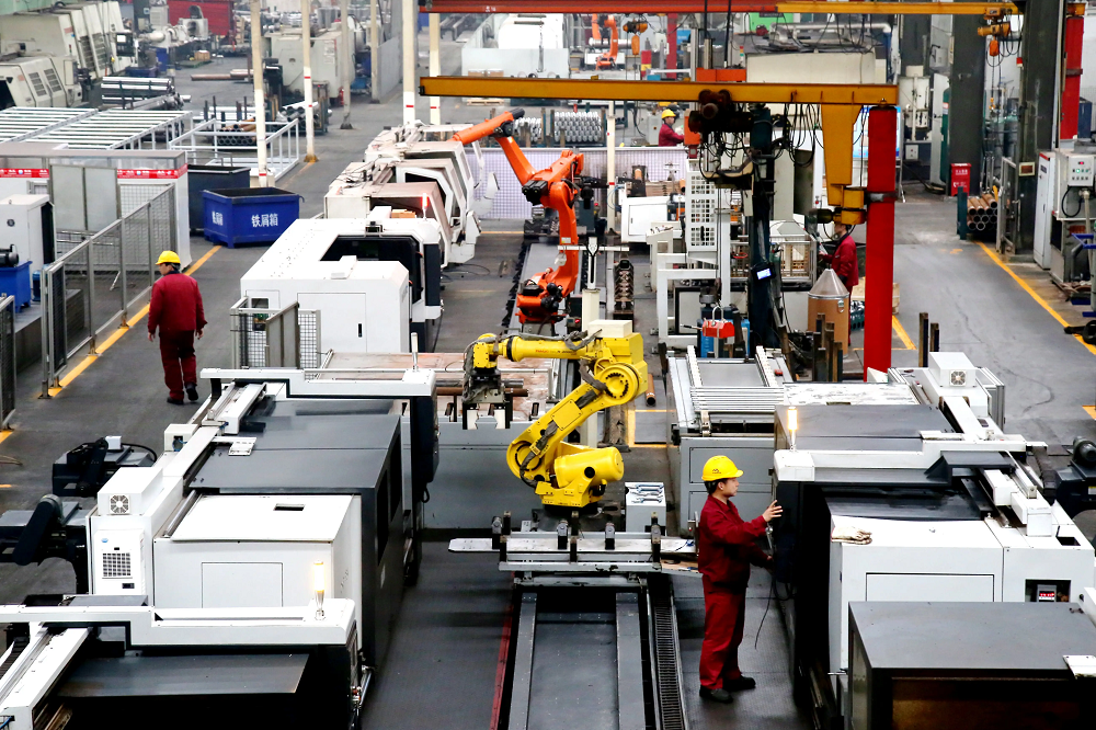 湖北佳恒科技股份有限公司工人和机器人在生产线上作业。 新华社发(曹忠宏摄)