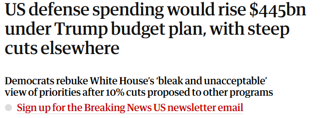 英国《卫报》文章称,美国国防开支将增加4450亿美元,而其他方面的开支将大幅削减。