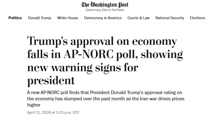 美联社-NORC公共事务研究中心4月21日公布的最新民调显示,受对伊朗发动军事行动及在经济方面应对不利等因素影响,美国总统特朗普的支持率降至33%,较3月降低5个百分点。大多数受访者认为,美国正朝着错误的方向发展。