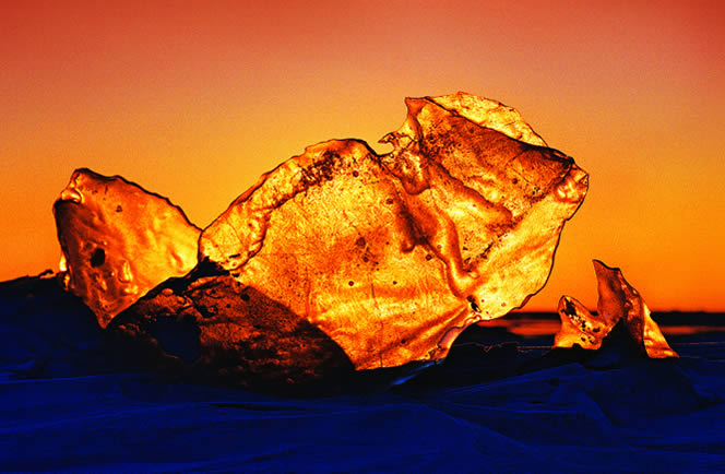 逆光下,天空、雾淞、雪地都泛着兰色,体现了冰雪的主色调。长长的树影使画面变得生动美丽。