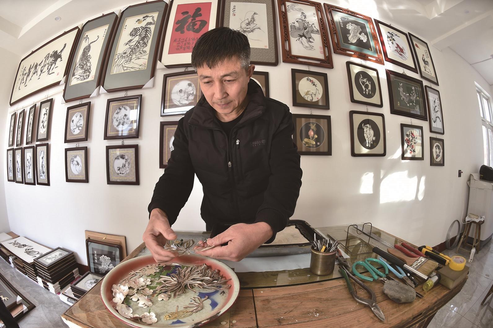 到了洪鑫的父亲洪植杰这一辈,接管了祖上传下来的铁画制作作坊。20世纪80年代,遵化铁画远销国内外,铁画作坊一年销售额可达100多万元,是本地经济支柱产业之一。那时,外贸部门每年都发来大量订单,订单多到接不过来,甚至不得不退单。当时最受欢迎的铁画题材仍然是传统的花鸟鱼虫、山水、侍女图等,100多位铁画匠人工作在流水线上,除了常规工序流程,分工精细到五官、衣服、饰品等都由专人制作。当年,铁画作坊里热火朝天的制作场面,让洪鑫记忆犹新,感慨万千。