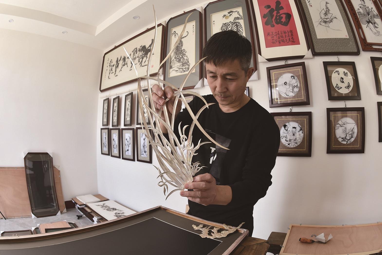 洪鑫将铁画进行装裱。 记者 刘洪超 摄