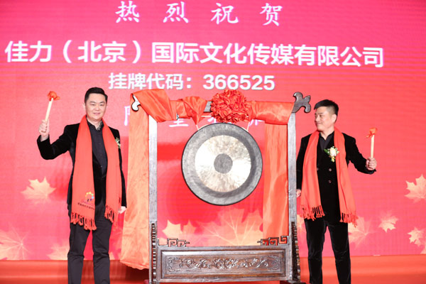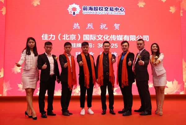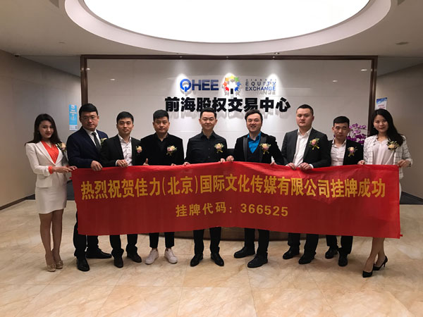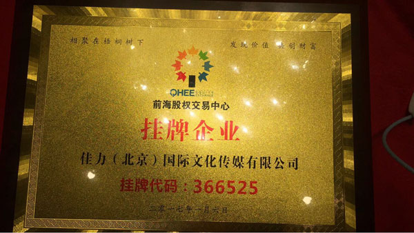 2017年1月18日,佳力(北京)国际文化传媒有限公司(以下简称:佳力公司)在深圳证券交易所正式挂牌敲钟上市;(挂牌代码:366525);佳力公司本次在深交所上市,意味着中国文化传媒产业的版图重新划分,并改写中国文化产业的发展蓝图,佳力公司必将为中国文化产业的发展添写上浓墨重彩的一笔!