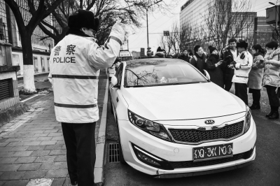 在骡马市大街虎坊桥路口附近,交警对一辆临时停放在禁停黄线旁的车辆进行劝离。 本报记者 邓伟摄