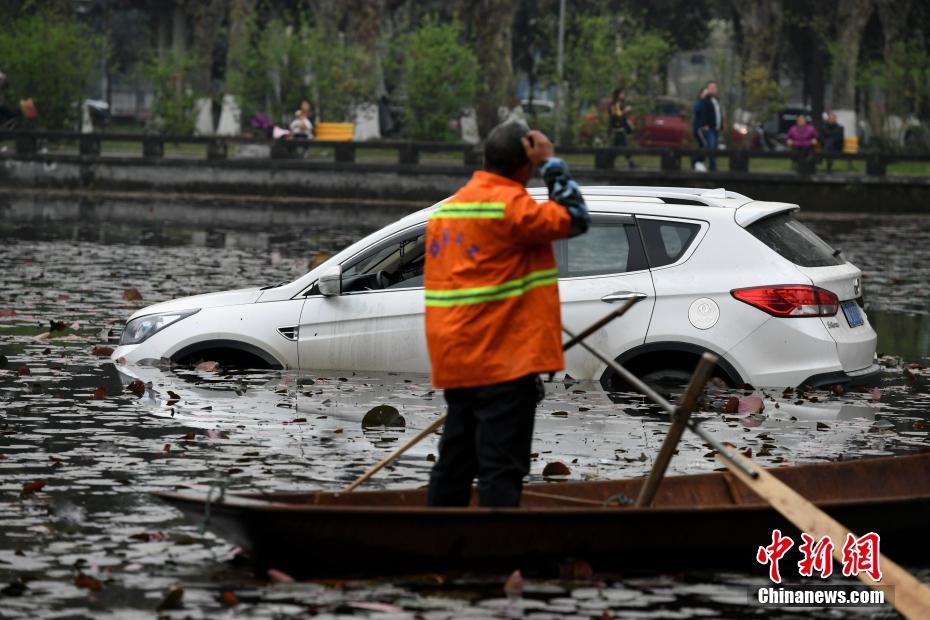 3月29日下午3点30分许,四川大学望江校区发生一起交通事故,一辆白色汽车撞毁该校荷花池一处石栏后坠入湖中。事故发生后,受伤司机被送往医院接受治疗。张浪摄