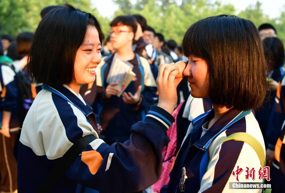 6月7日,在河北石家庄45中,参加高考的女学生正用鸡蛋帮同学敷脸放松面部神经。当日,为期两天的2017年中国高考正式拉开大幕,共有940万名考生参加考试。中新社记者 翟羽佳 摄