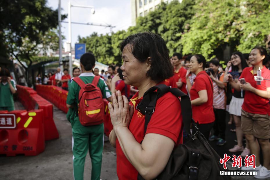 6月7日,广州执信中学门口,一名母亲在考生步入考场后,双手合十为考生祈祷。当日,一年一度的高考拉开大幕,今年高考报名人数为940万人。中新社记者 陈骥旻 摄