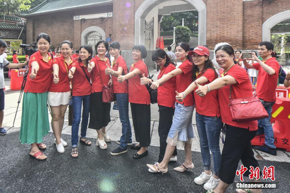 6月7日,广州执信中学门口,家长们身穿红衣为考生打气。当日,一年一度的高考拉开大幕,今年高考报名人数为940万人。 中新社记者 陈骥旻摄