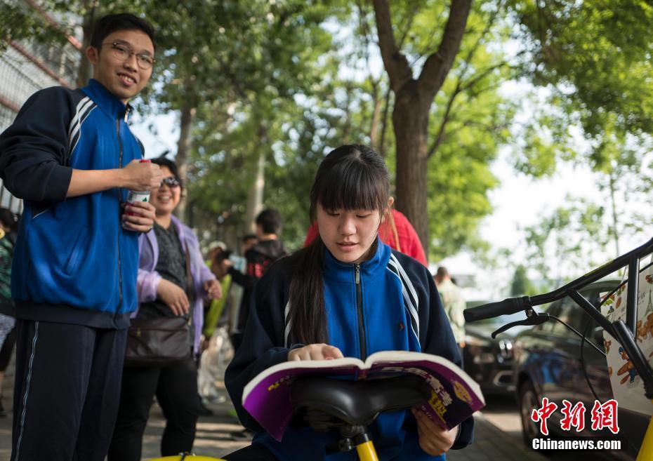6月7日,2017年高考拉开帷幕,在北京市第八十中学考点外,一名考生在突击看题。据悉,今年高考报名人数为940万人。 中新社记者 侯宇摄