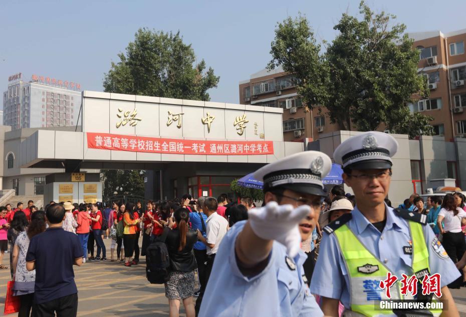 6月7日,2017中国普通高等学校招生全国统一考试开考,在北京市通州区潞河中学考点外,北京交警维护考场外秩序。 中新社记者 杨可佳摄