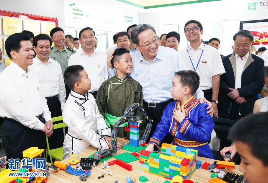 8月9日,中共中央政治局常委、全国政协主席、中央代表团团长俞正声率中央代表团一分团走进呼和浩特基层社区、企业单位,把以习近平同志为核心的党中央的亲切关怀带给当地各族干部群众。这是俞正声在呼和浩特赛罕区多民族聚居的兴康社区与孩子们互动交流。新华社记者姚大伟 摄